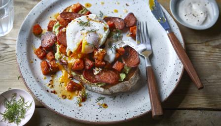 A speedy lunch or an incredible breakfast, brunch or supper from the air fryer. Sweet potato goes so well with smoky chorizo – add a spoonful of yoghurt and a drizzle of garlic chilli butter and you’re in heaven.