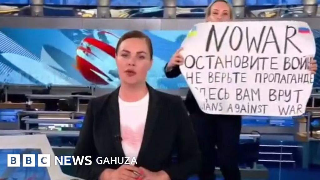 Umugore ufashe icyapa kiriho amagambo yamagana intambara yageze muri studio ya televiziyo igenzurwa na leta mu gihe basomaga amakuru kuwa mbere nijoro.