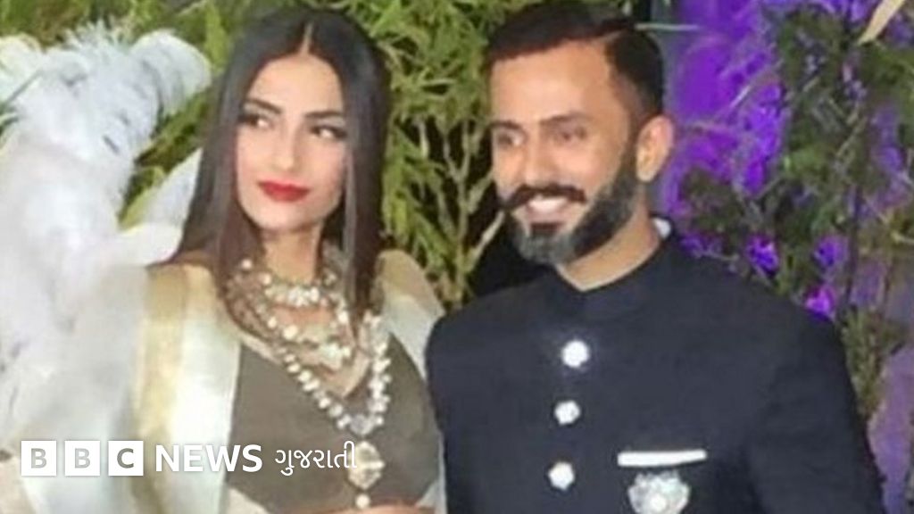 રિસેપ્શનમાં સોનમે વ્હાઇટ અને બ્લેક કલરનો ડ્રેસ પહેર્યો, જ્યારે આનંદે ઇન્ડો-વેસ્ટર્ન ડ્રેસ પહેર્યો હતો.