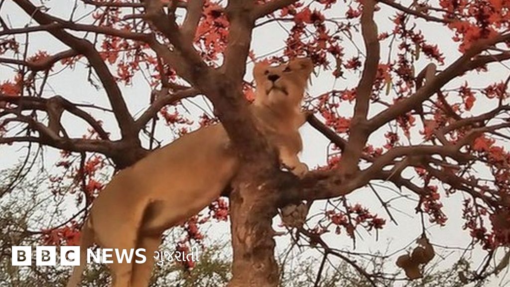 ઇમેજ કૅપ્શન, કેસૂડાના વૃક્ષ પર ચડેલો સિંહ