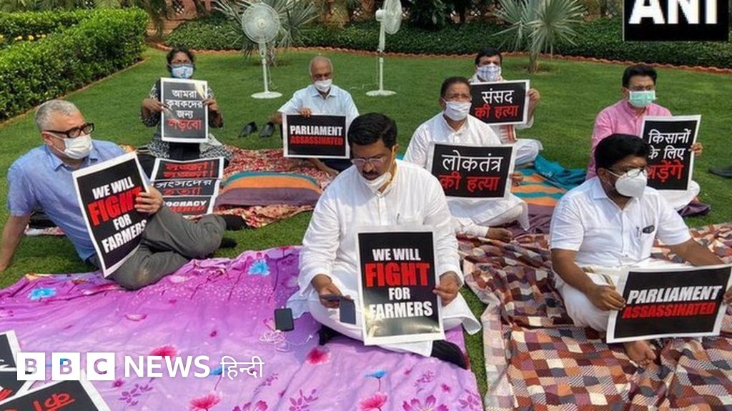 निलंबन के बावजूद कई विपक्षी सांसद संसद के बाहर लॉन में चादर वग़ैरह बिछाकर बैठे हैं और बिल का विरोध कर रहे हैं.