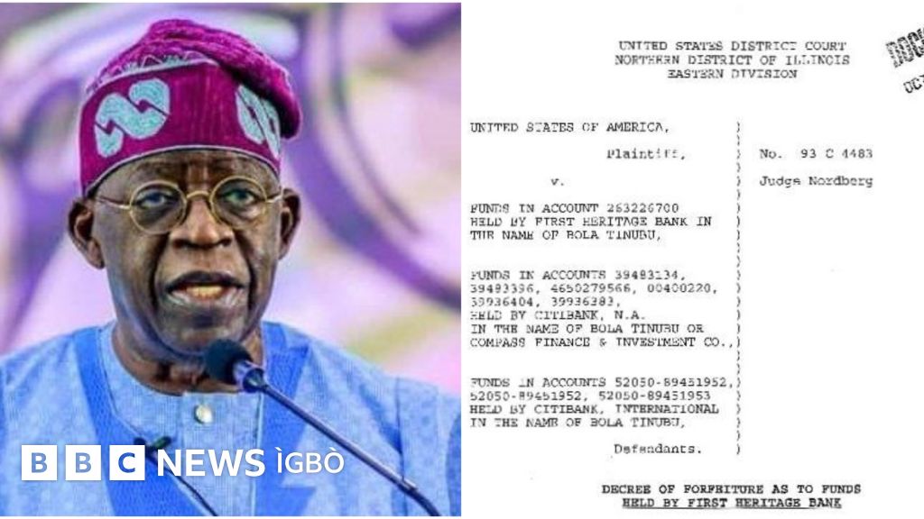 Akwụkọ ahụ nke bu akara afọ 1993 gosiri na ngalaba 'Justice Department' mba Amerịka boro Maazị Tinubu, bụ onye meriri ntuliaka ịbu onyeisala Naịjirịa na 2023, ebubo na ego dị n'ọbaego ya si na mgbere ọgwụike.
