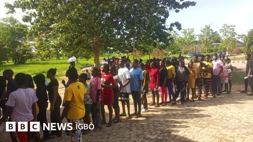 Oge BBC Igbo gara n'ogige ule dị na mahadum Ebonyi State University, anyị hụrụ ọtụtụ ụmụakwụkwọ kwụrụ n'ahịrị ma na-eche ka oge ha ruo ide ule ahụ.