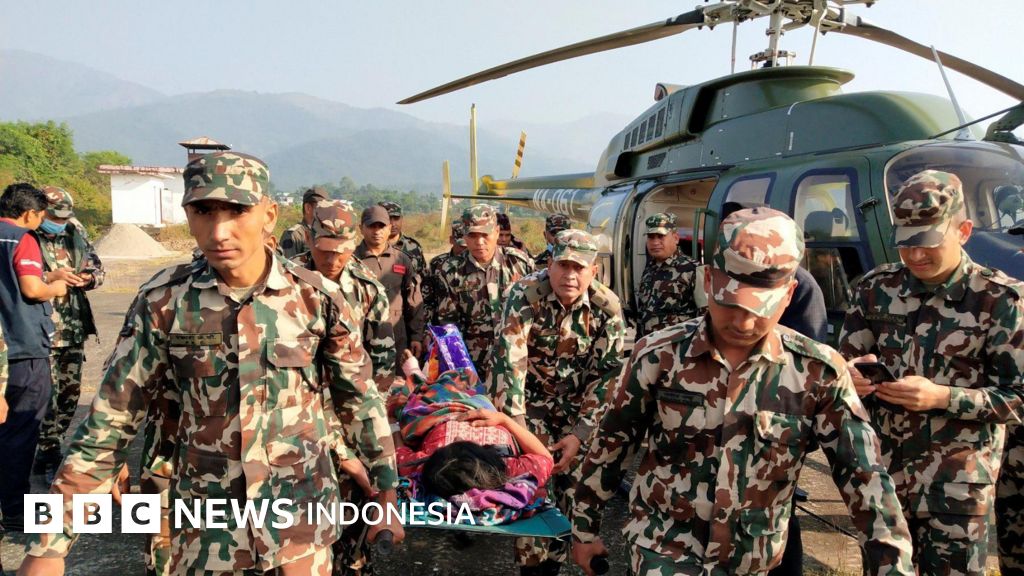 Keterangan gambar, Personel TNI membawa korban luka dengan tandu pasca gempa di Jajarkot, Nepal, 4 November 2023.