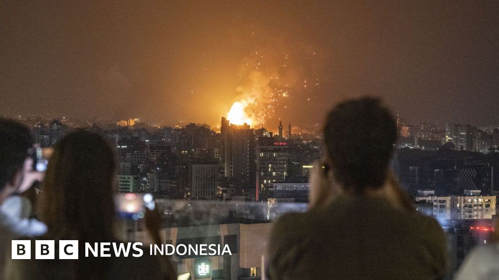 Keterangan gambar, Orang-orang mengambil foto saat asap dan api membubung setelah serangan udara Israel di lingkungan Dahiyeh di selatan Beirut, Lebanon, 06 Oktober 2024.