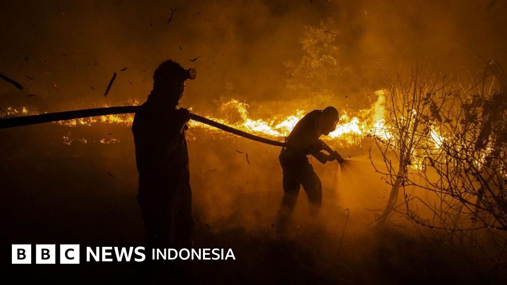 Keterangan gambar, Petugas pemadam kebakaran berupaya memadamkan api di lahan gambut dan ladang yang terbakar pada 23 September 2023 di Ogan Ilir, Sumatera Selatan.