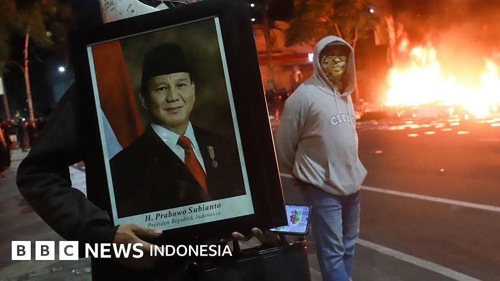 Keterangan gambar, Demonstran membawa bingkai foto Presiden Prabowo pada protes massa Agustus 2025 di Surabaya, Jawa Timur.