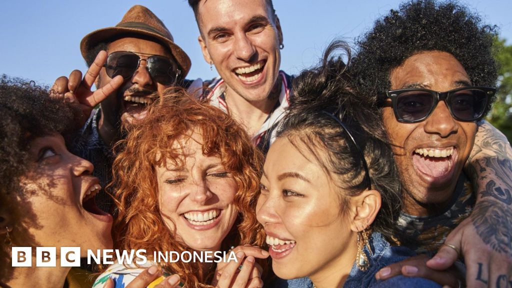Sekumpulan anak muda tertawa riang dan tersenyum lebar saat berfoto
