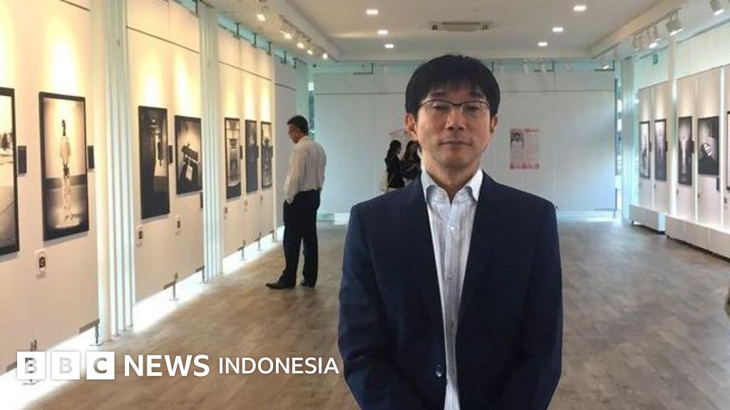 Keterangan gambar, Fotografer Toshi Kazama dipotret di galeri yang memajang berbagai karya fotonya.