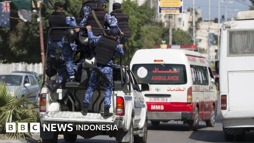 Keterangan gambar, Aparat keamanan mengawal ambulans yang membawa jenazah tiga warga Palestina yang digantung oleh Hamas.