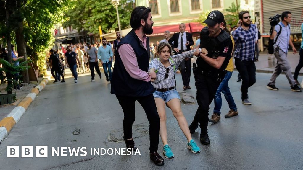 Wartawan BBC di Istanbul, Mark Lowen, melaporkan polisi sempat menembakkan gas air mata dan peluru plastik untuk membubarkan massa yang berkumpul di Lapangan Taksim pada Minggu (25/06). Polisi juga menahan sejumlah orang yang berusaha mengikuti acara tersebut.