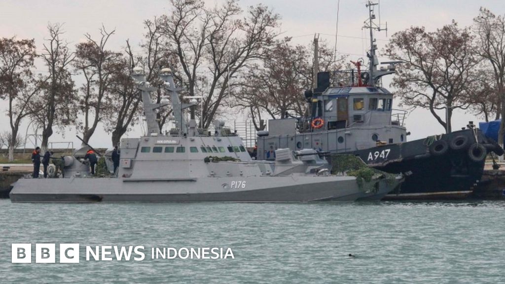 Keterangan gambar, Kapal Ukraina yang ditahan Rusia terlihat di Pelabuhan Kerch, Krimea, pada 26 November 2018.