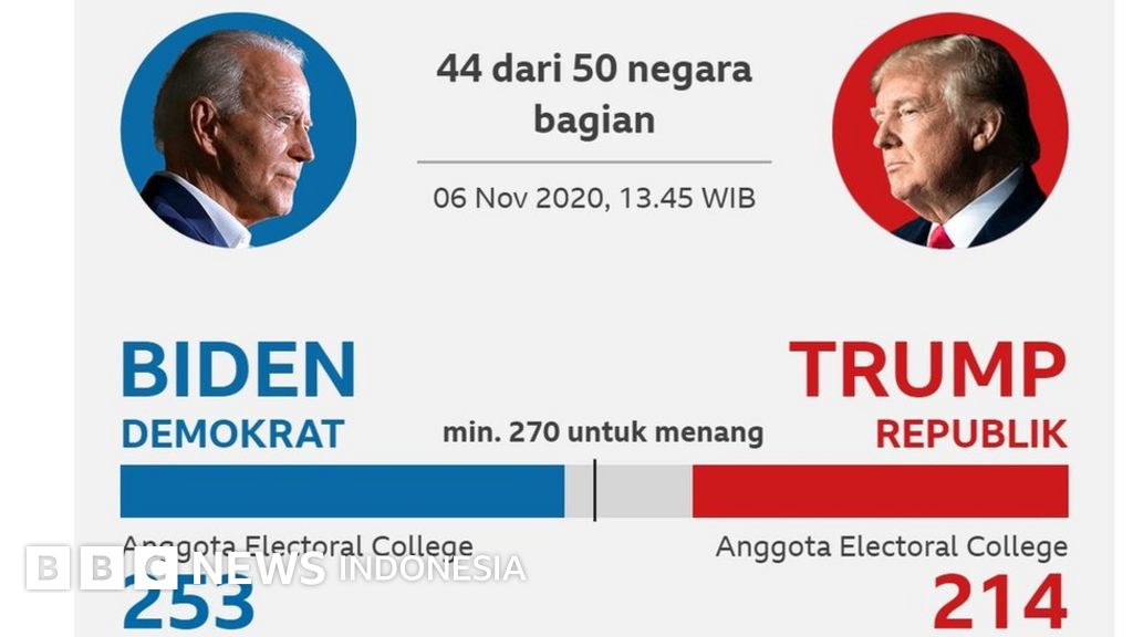 Saat ini Biden memperoleh 253 suara elektoral - hanya kurang 17 suara dari kemenangan - sementara Trump meraih 214 suara.