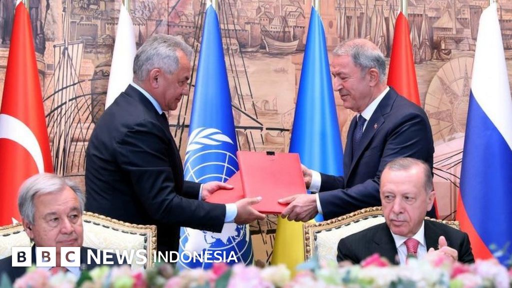 Menteri Pertahanan Rusia, Sergei Shoigu, menandatangani kesepakatan lebih dulu. Menteri Infrastruktur Ukraina, Oleksandr Kubrakov, menyusul kemudian.