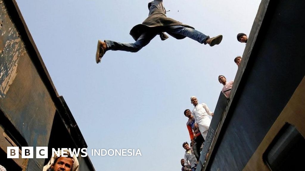 Foto akrobatik yang diambil pada pekan ini di Bangladesh yang merekam penumpang yang melompat dari gerbong kereta ke gerbong lainnya di kota Tongi, di luar kota Dhaka, tampak merupakan intisari dari lompatan eksistensial.