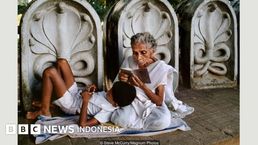Dalam gambar ini, McCurry memotret seorang wanita yang membaca untuk cucunya di luar kuil.