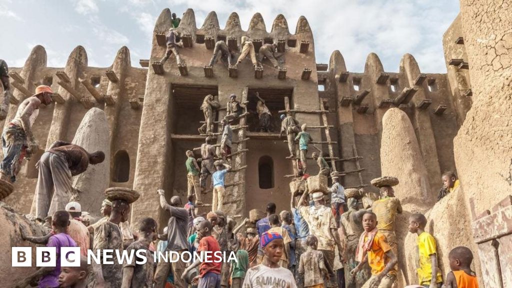 Selama perayaan Crépissage, penduduk di Djenné, Mali, bahu membahu membangun kembali Masjid Agung, bangunan terbesar di dunia yang terbuat dari lumpur.