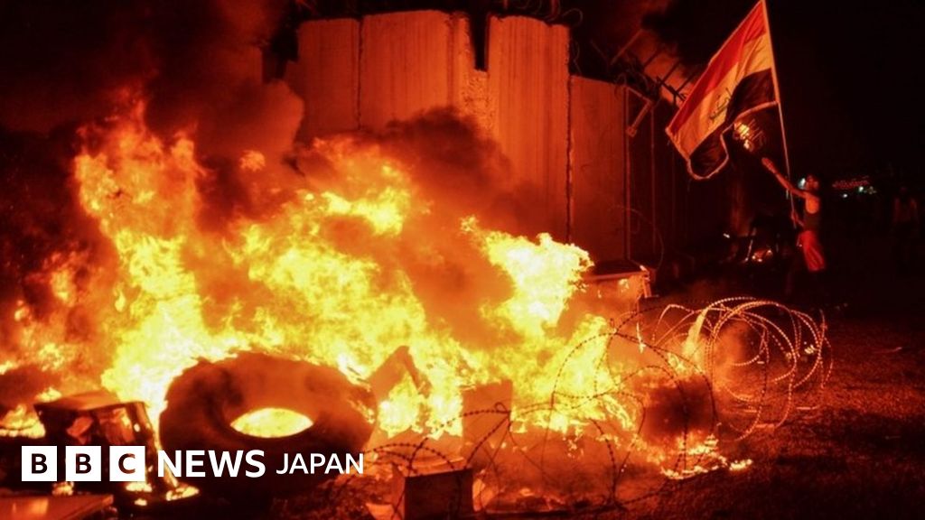 反政府デモが続くイラクで27日、デモ隊が南部ナジャフにあるイラン領事館に放火した。領事館が炎に包まれる間、抗議に参加した人たちは、「イランはイラクから出て行け」と繰り返した。