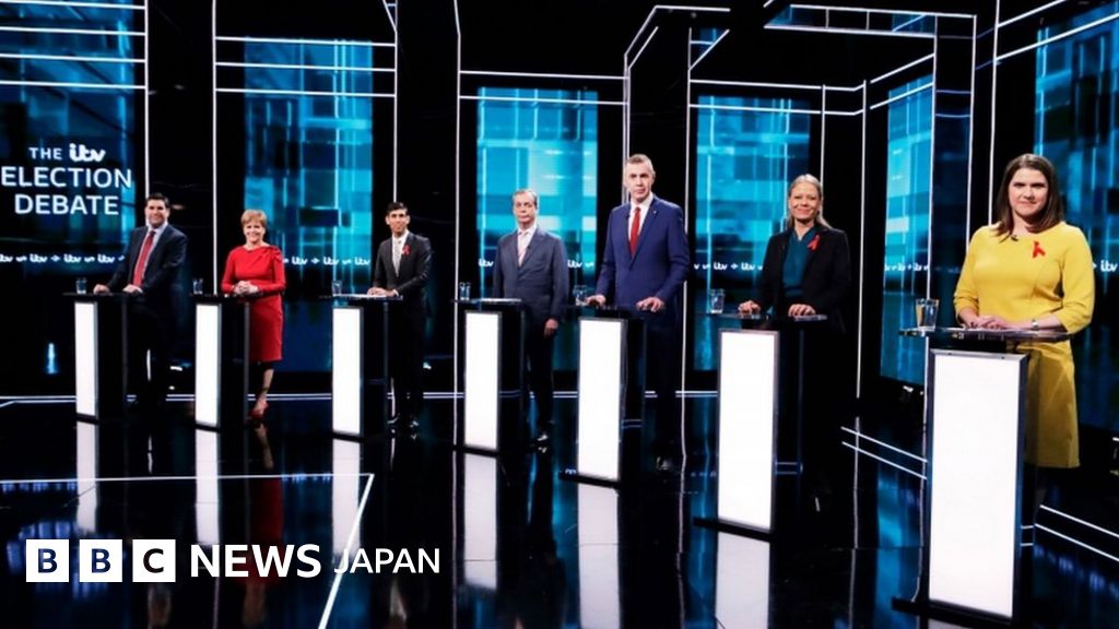 画像説明, 左側からリチャード・バーゴン影の法相(労働党)、SNPのニコラ・スータージョン党首、リシ・スーナック財務長官(保守党)、ブレグジット党のナイジェル・ファラージ党首、ウェールズ党プライド・カムリのアダム・プライス党首、緑の党のシャーン・ベリー党首、自由民主党のジョー・スウィンソン党首