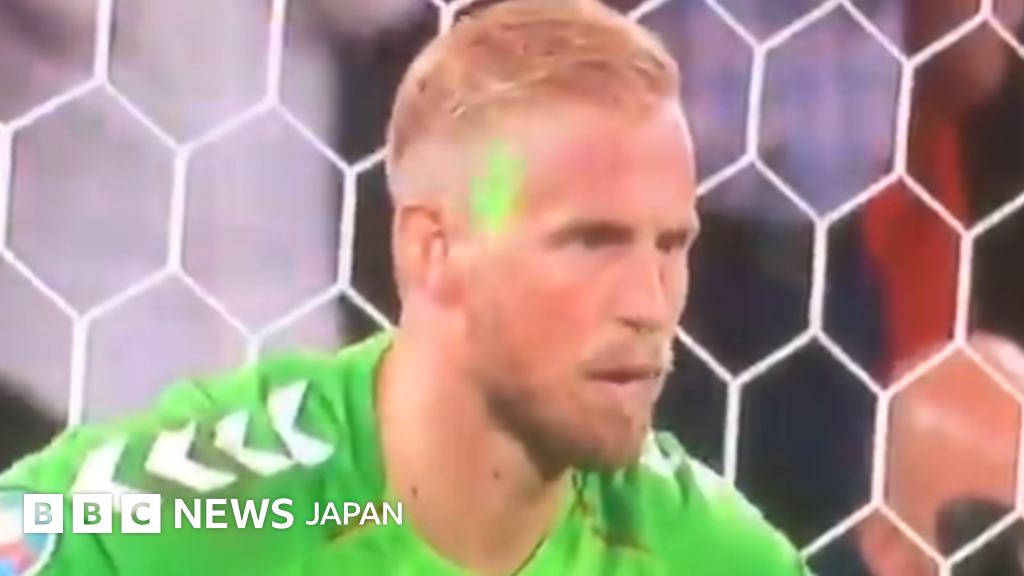 画像説明, デンマークのゴールキーパー、シュマイケルの顔にレーザー光線が当てられた