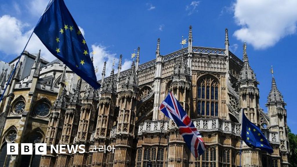 사진 설명, 영국 의회 앞, 유럽연합과 영국 국기가 휘날리고 있다
