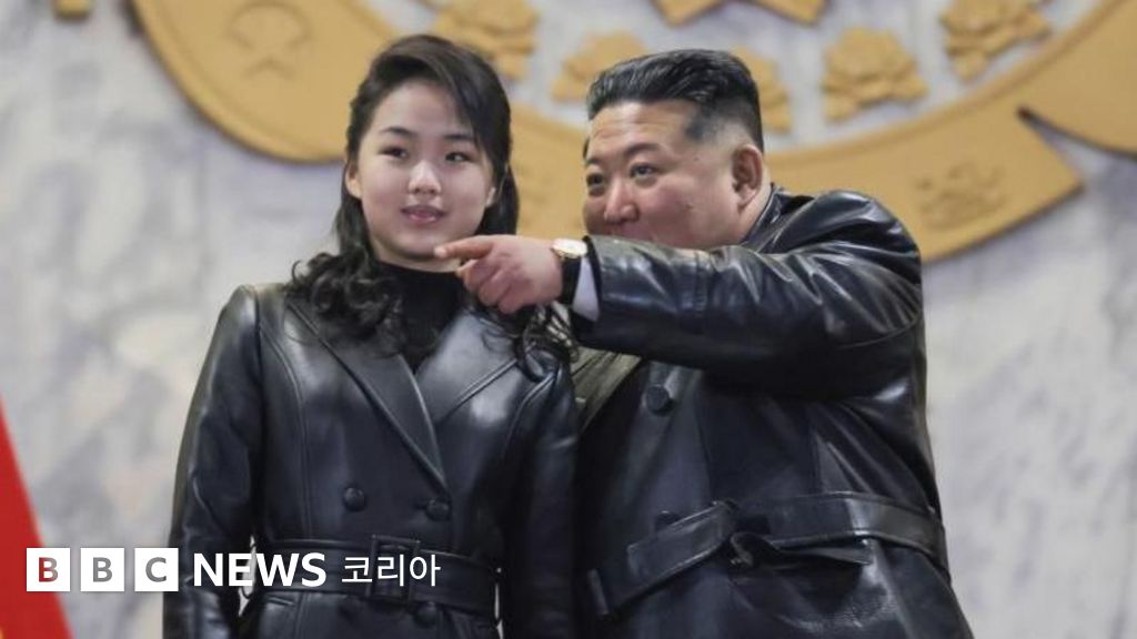 사진 설명, 김정은 위원장과 그의 딸 김주애가 2026년 3월 8일 북한 평양 정주영체육관에서 열린 '국제 부녀절' 기념 공연을 관람하고 있다