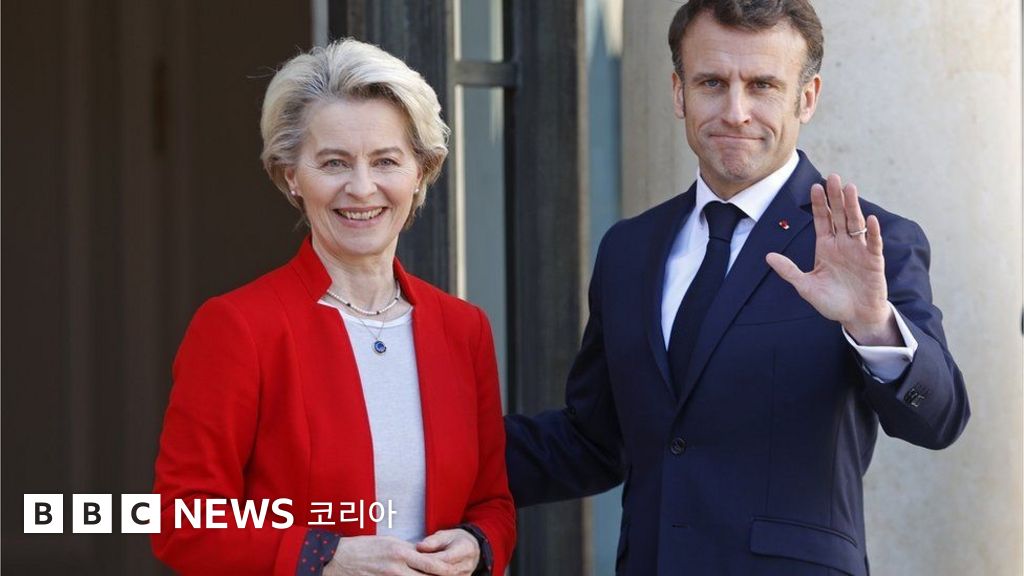 사진 설명, 동반 방중을 앞두고 이번 주 초 파리에서 만난 우르줄라 폰데어라이엔 EU 집행위원장과 에마뉘엘 마크롱 프랑스 대통령