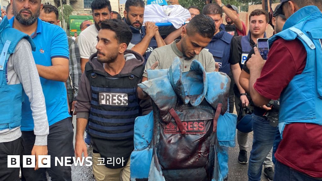 사진 설명, 지난 10일 가자 지구에서 한 기자가 죽은 동료의 피 묻은 언론인 방탄조끼를 들고 있다