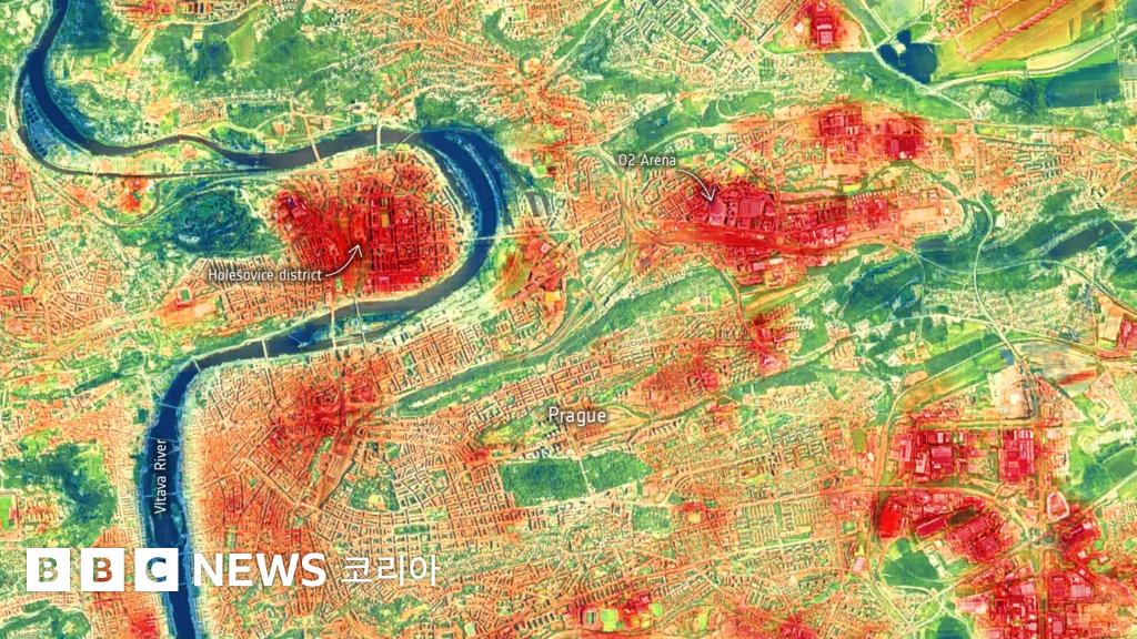 프라하를 찍은 이 이미지는 우주에서 촬영한 도시 열 지도다. 녹지 공간과 백색 도로, 수자원이 도시에 미치는 영향이 이 지도에 드러난다. 즉 이러한 공간은 자연 그대로의 방식으로 도시를 식혀줘, 도시가 치명적인 폭염에 대응할 수 있게 도와주는 것이다.