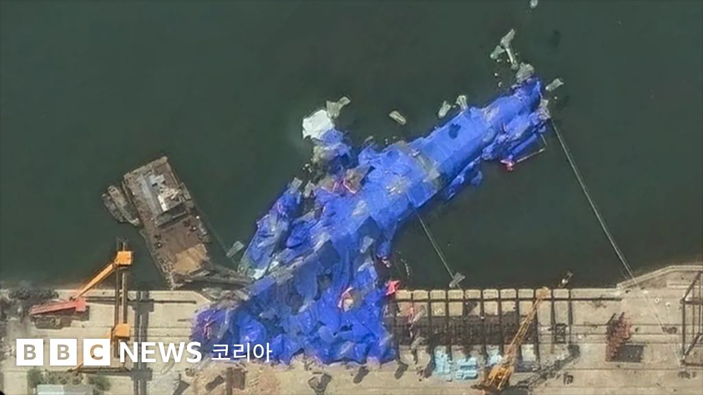 위성 이미지에는 대형 파란색 방수포로 덮인 채 옆으로 누워 있는 선박이 보였으며, 선박의 일부는 육지에 있는 것으로 나타났다.