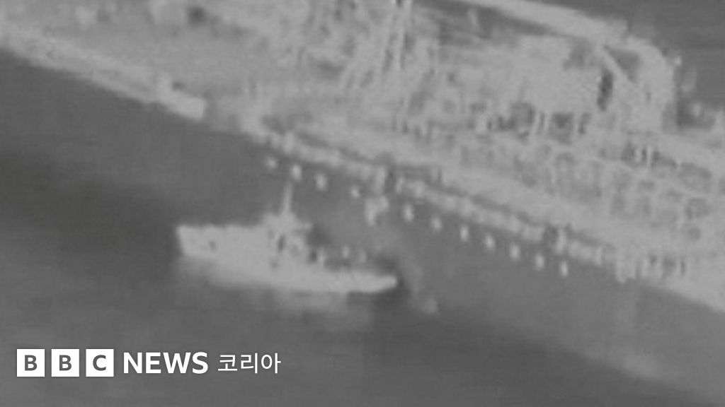 사진 설명, 트럼프 대통령은 한 보트가 구멍이 뚫린 선체에 접근해 불발 흡착형 기뢰를 제거하는 장면을 증거로 제시했다
