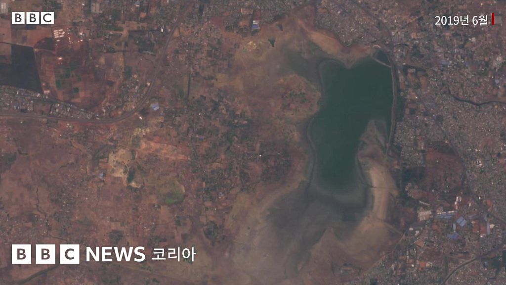 2018년 비가 많이 내리지 않으면서 다달이 저수지 물이 말라간다. 저수지가 줄어드는 모습은 위성사진으로 확연히 드러난다.