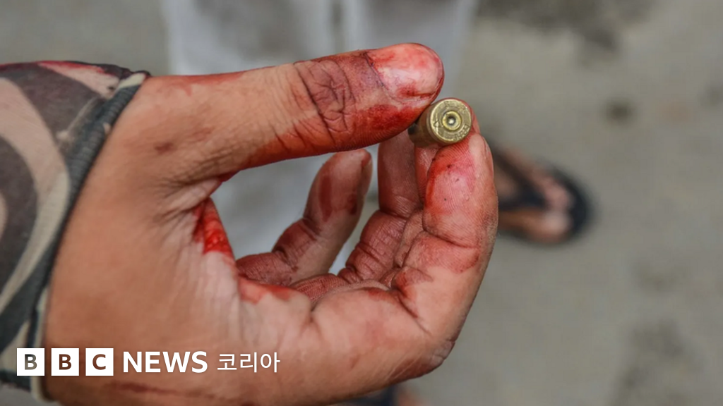 사진 설명, 2021년 잔혹했던 시위대 진압 현장에서 발견된 탄피에 미얀마 국방부의 마크가 눈에 띈다