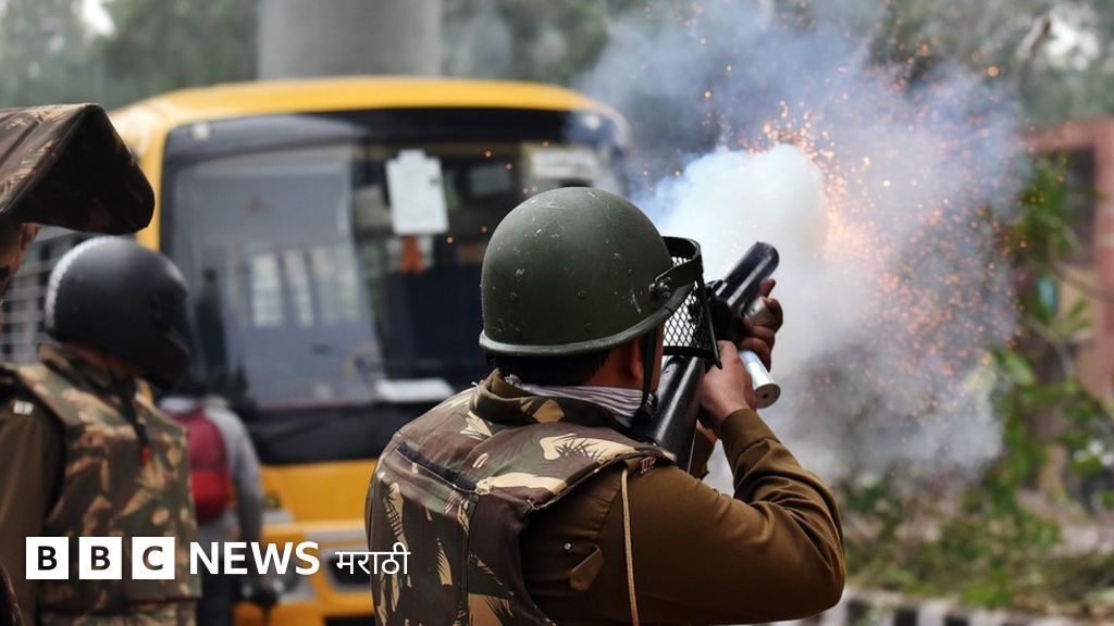 जामिया विद्यापीठाजवळ आंदोलकांच्या दिशेने अश्रुधुराच्या नळकांड्या फोडताना दिल्ली पोलीस