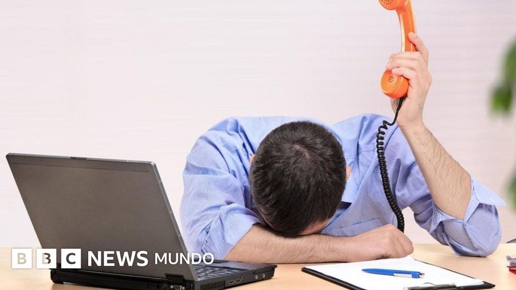 Un empleado con expresión de desesperación, frente a una laptop y con un teléfono
