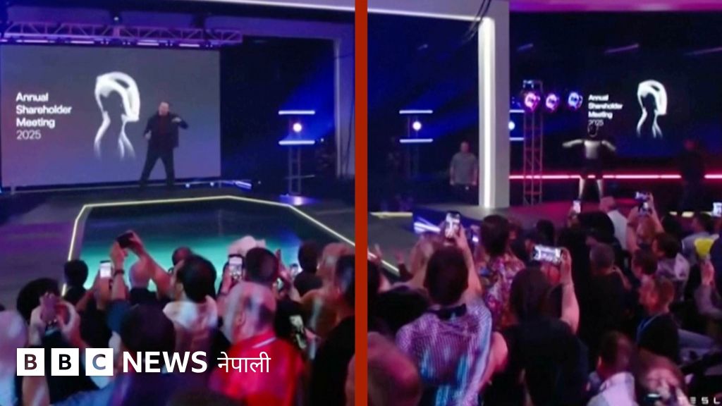 भिडिओ क्याप्शन सुरु हुँदैछ, टेस्लाले १० खर्ब डलर दिने भएपछि रोबटसँग नाचे इलोन मस्क
