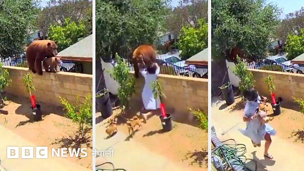 घरपछाडिको पर्खालमा उनले एउटा ठूलो भालु देखिन् र कुकुर बचाउन दौडेर भालुलाई घचेट्न गइन्।