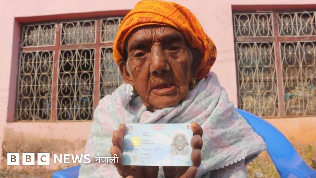 तस्बिरको क्याप्शन, २०७५ साल मंसिरमा पाँचथरकी १०१ वर्षीया भगवती भण्डारी आफूले पाएको राष्ट्रिय परिचयपत्रका देखाउँदै। तात्कालिक गृहमन्त्री रामबहादुर उनलाई परिचयपत्र दिएर राष्ट्रिय परिचयपत्र वितरण सुरु गरेका थिए। भण्डारीको मृत्यु भइसकेको छ।