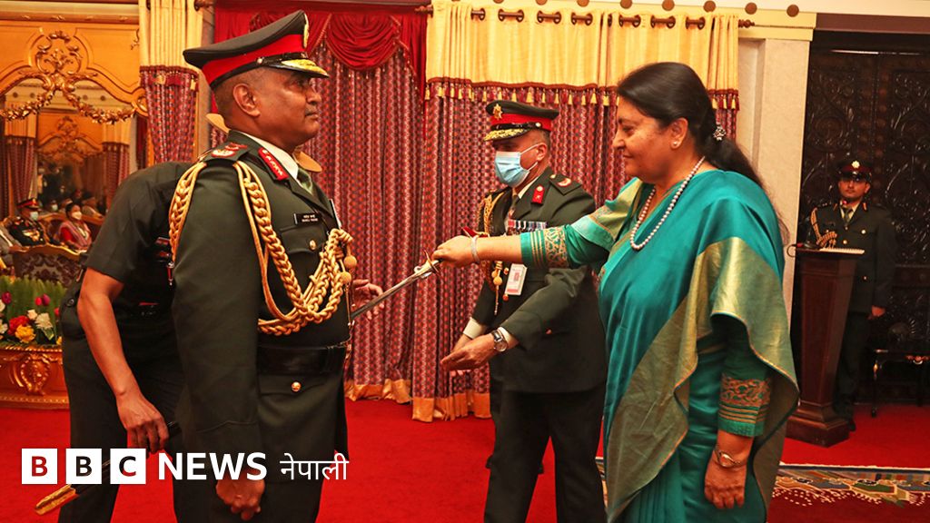 तस्बिरको क्याप्शन, भारतीय सेनाध्यक्ष मनोज पांडे नेपाली सेनाको मानार्थ महारथीको सम्मान ग्रहण गर्दै