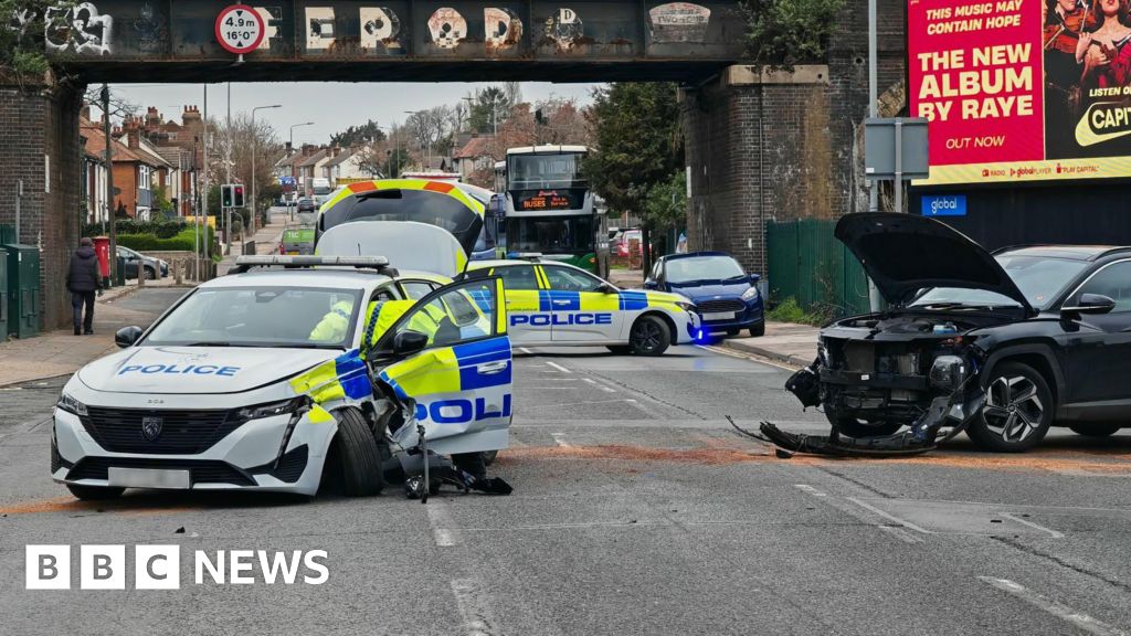 Martin FarncombeA road was closed after a police car was involved in a collision on a busy town route.