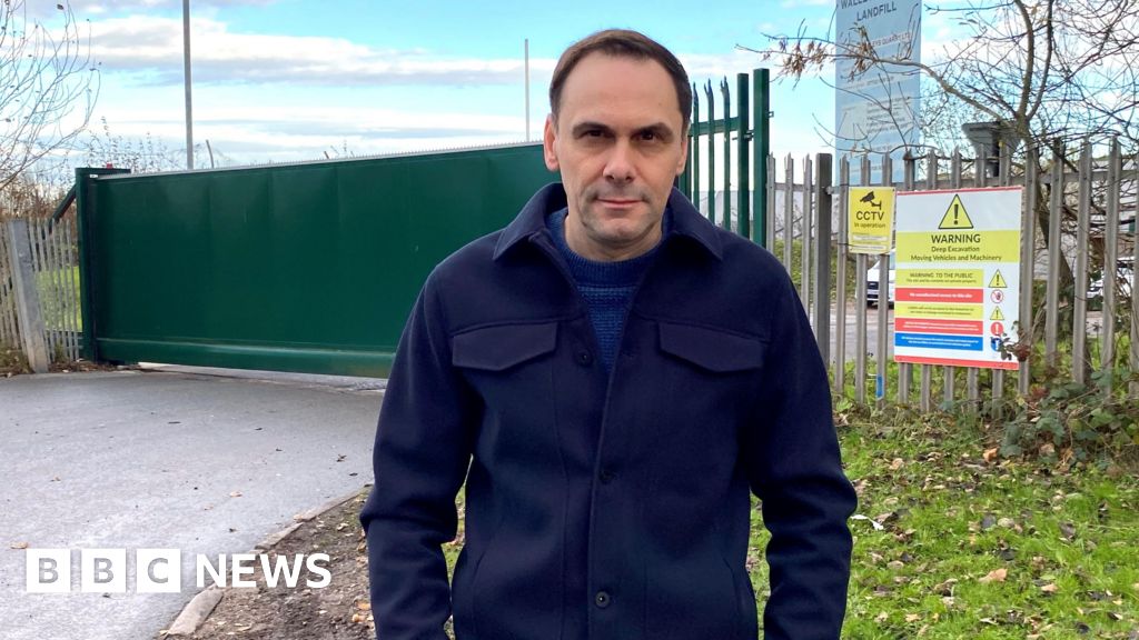 Newcastle-under-Lyme Borough Council Simon Tagg, a man wearing a navy blue coat, is standing outside a large set of green gates at the entrance to a landfill site. There is signage on fencing to the side of the gates which indicates the site is hazardous.Newcastle-under-Lyme Borough Council