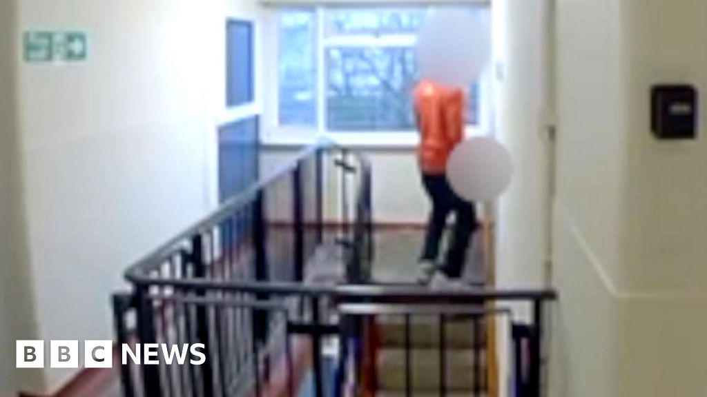 The footage, given to the BBC, shows a man slowly climbing a flight of stairs inside a block of flats in Loughton, Essex, before turning and standing at a closed doorway for several seconds.