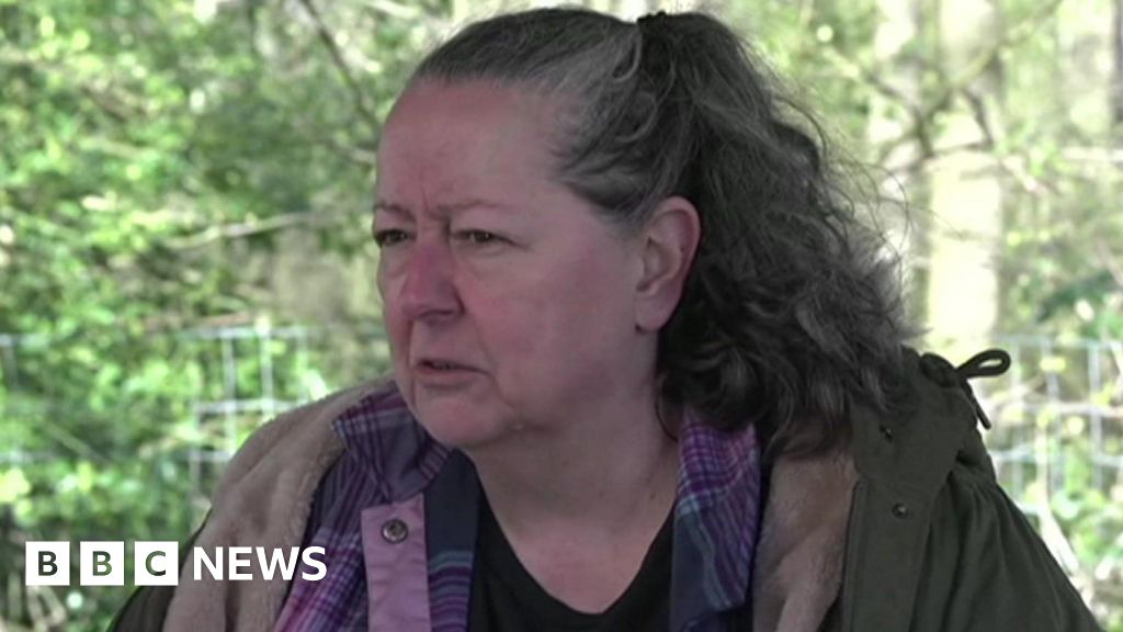 BBC A woman with long dark hair and wearing a green coat over a purple flannel shirt over a dark t-shirt, looks to her right. Trees and greenery can be seen behind her.BBC
