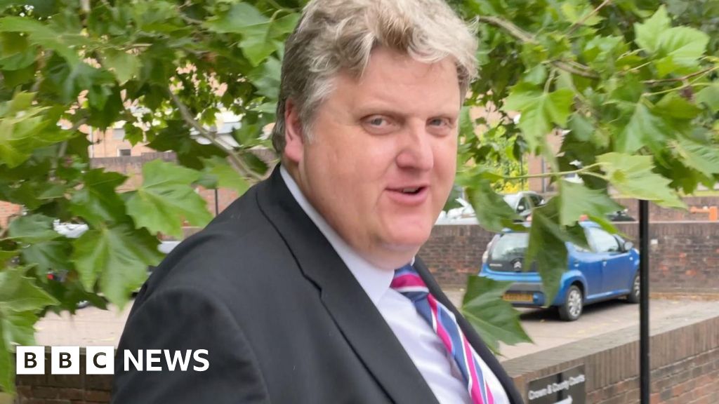 Robby West/BBC Gregory Hill, a man in a black suit jacket, white shirt and striped tie. He has blond hair and is pictured outside court in Norwich. A tree, a wall and a blue Citroen car are behind him.Robby West/BBC