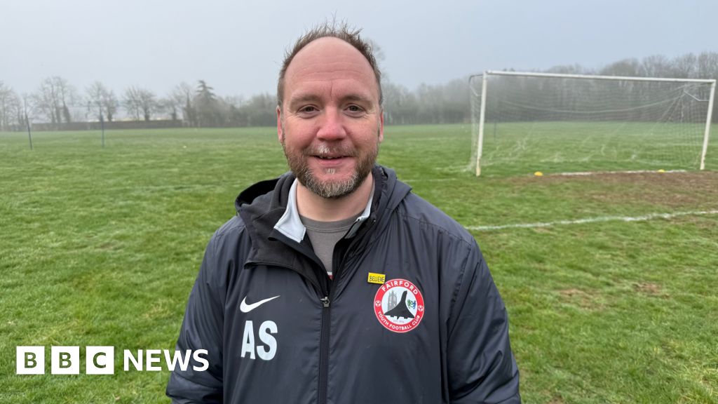 BBC Adam Slowman wearing a Nike branded Fairford Youth FC windbreaker. a grass pitched goal area with a muddy surface can be seen in the background.BBC