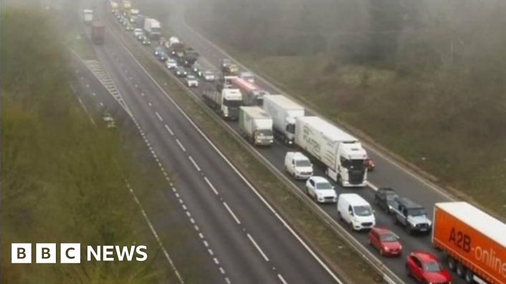 National Highways Queuing vehicles, including cars and lorries on a road in slightly foggy conditions.National Highways