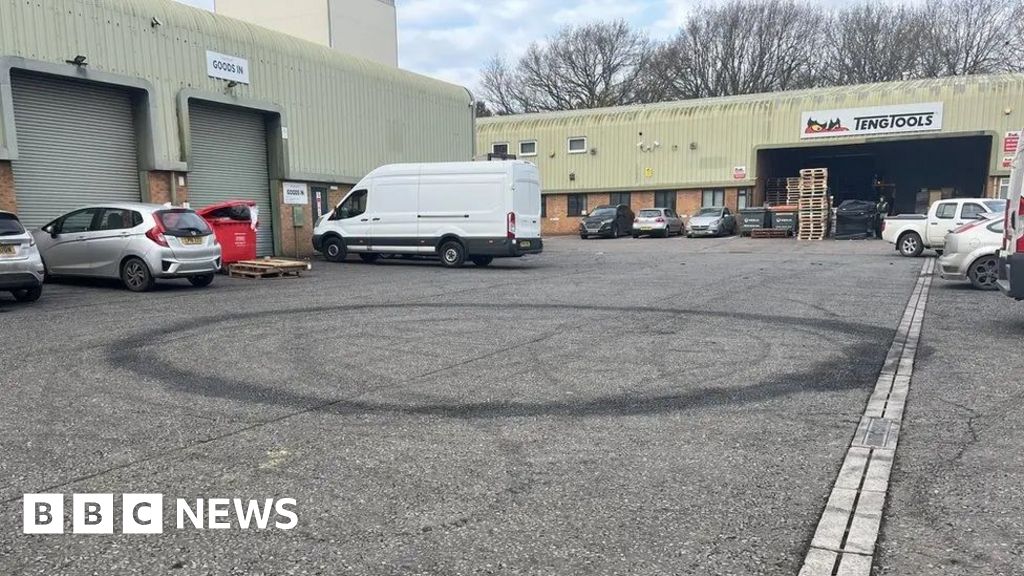 Nicola Haseler/BBC A road and car park in an industrial estate with a two-storey building beyond and a single-storey building with large shutters to the left. There are cars and vans parked near the buildings. A large black circle - a skid mark - is in the centre of the picture. More faint circles are visible around it.Nicola Haseler/BBC