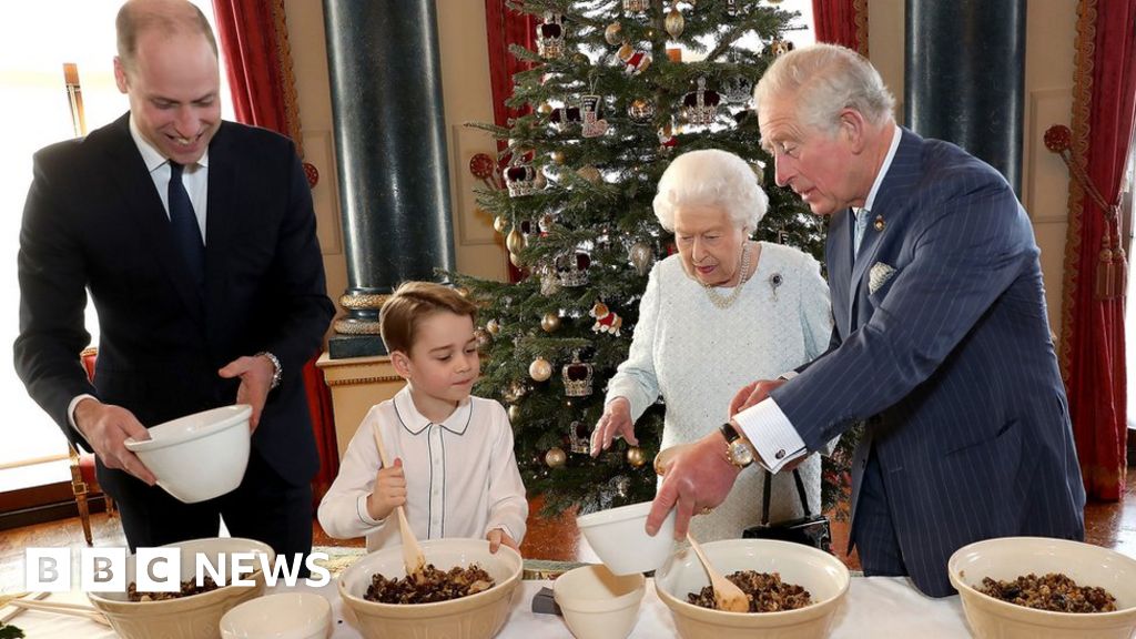 PA Media Queen Elizabeth II, the Prince of Wales, the Duke of Cambridge and Prince George preparing special Christmas puddings in the Music Room at Buckingham Palace, London, as part of the launch of The Royal British Legion"s Together at Christmas initiativePA Media