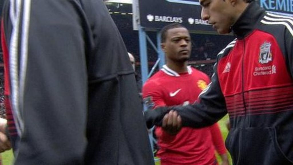 Luis Suarez refuses to shake the hand of Patrice Evra ahead of the Premier League clash between Manchester United and Liverpool.