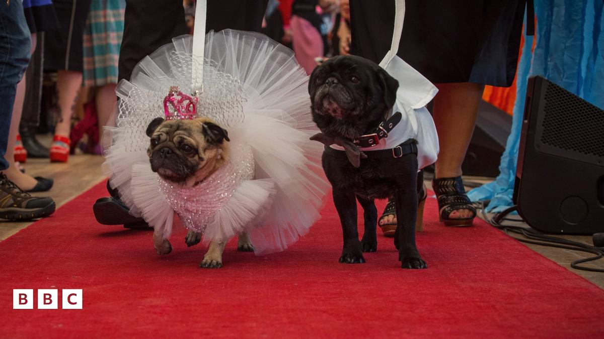 Jasper and Jasmine got married in front of a crowd of 350 human guests and 60 pugs in St Kilda, Australia.